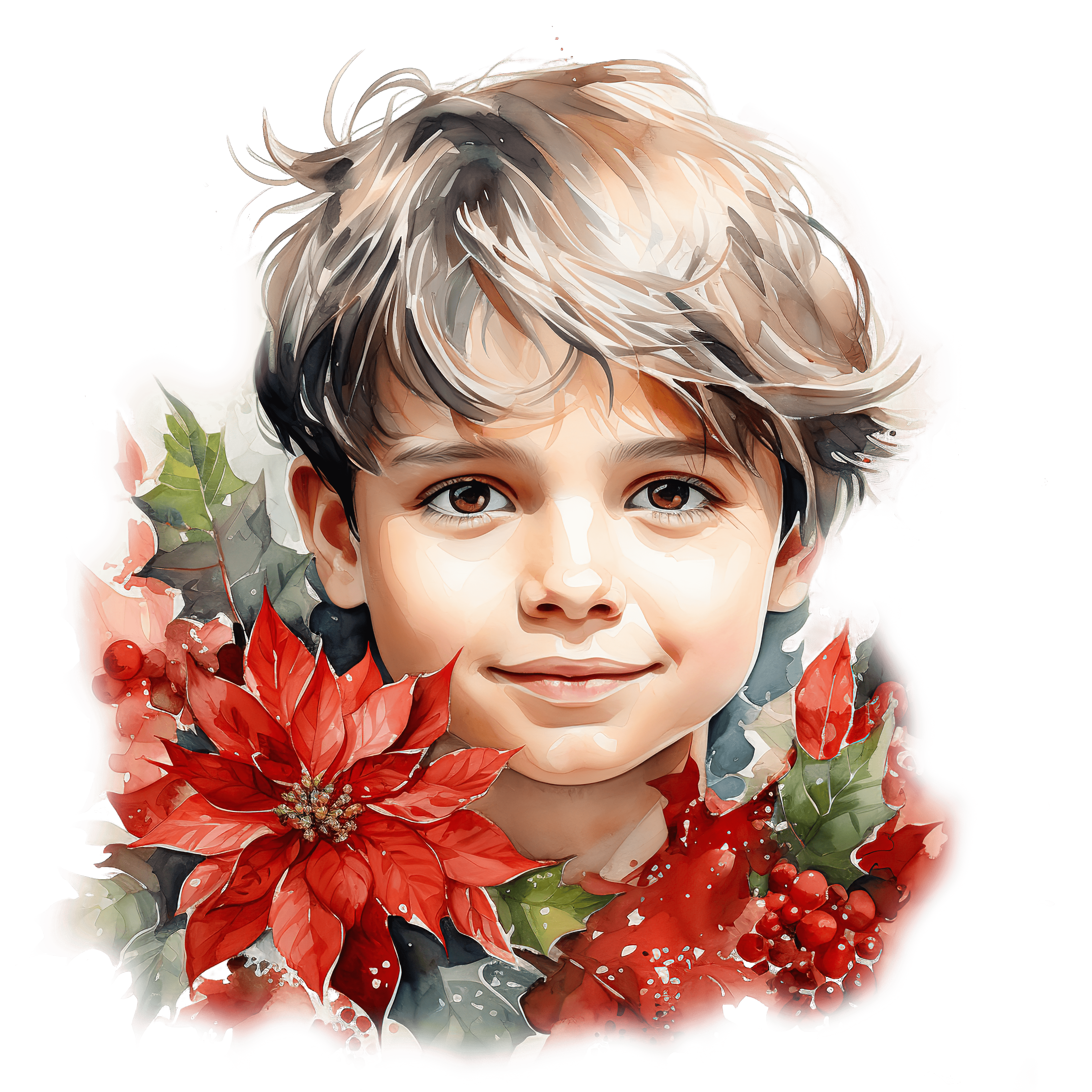 Young Child Surrounded by Festive Holly and Poinsettia Portrait of a young child with poinsettia and holly leaves.Download PNG ▼Download JPG ▼Related posts:Owl clipart with colorful blocks illustrationBlueberry Tart with Golden Crust in Clipart StylePurple Rose with Dew Drops on Black Background IllustrationWatercolor Lemon with Leaves and Sliced Half fruit yellow green clipart vectorArtistic Sun with Central Heart Shape on Black BackgroundYellow starfish with dotted texture cartoon designTall giraffe clipart with long neck and spotsGlittery Golden Butterfly With Sparkling WingsThree Ducks in Santa Hats with Snowy BackgroundDetailed White Lily Flower with Green Leaves on BlackPapaya Halves with Seeds and Green Leaves ClipartIntricate Red and Blue Mandala with Floral Patterns