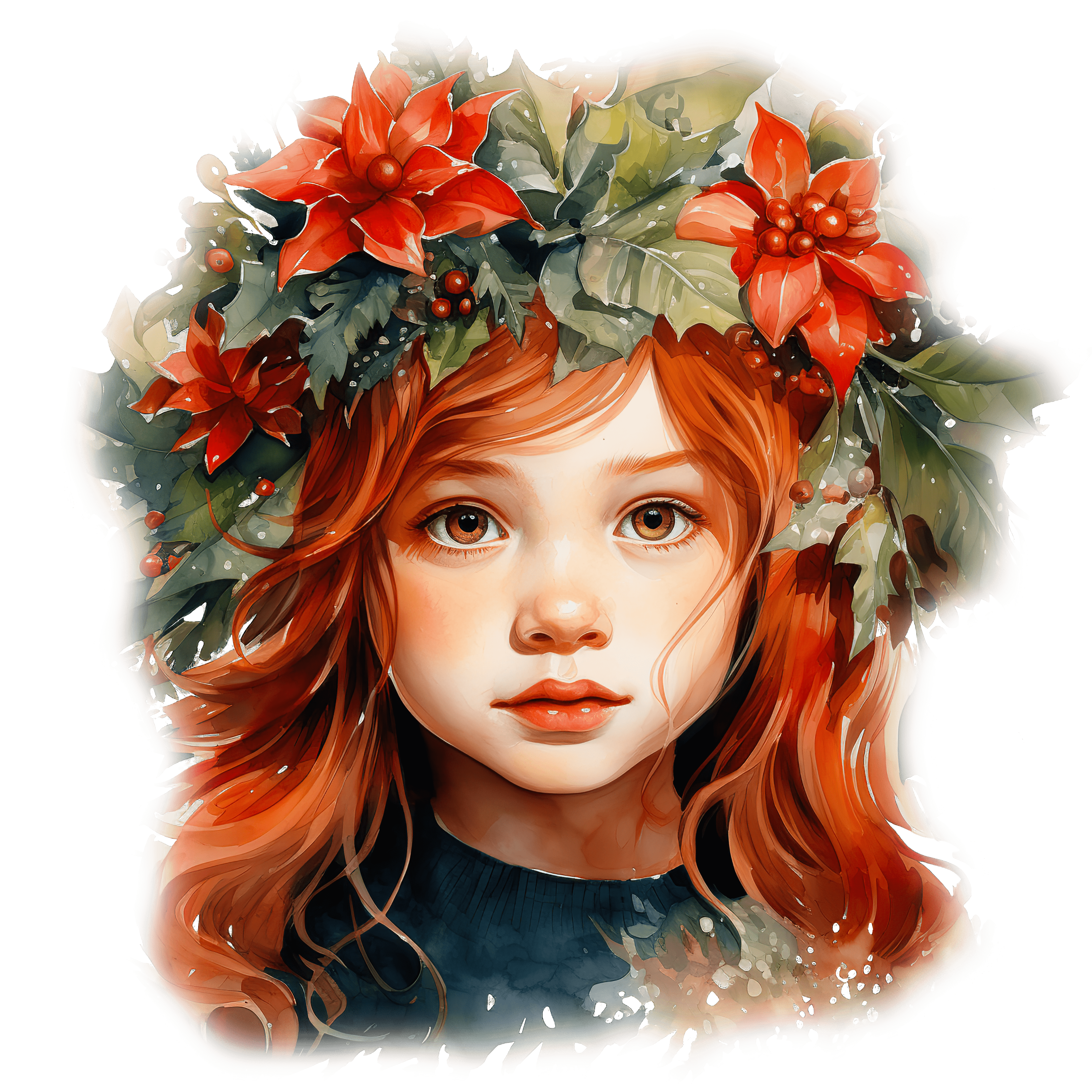 Young Girl with Festive Red Poinsettia and Greenery Wreath Girl with red floral and greenery wreath symbolizing holiday celebrations.Download PNG ▼Download JPG ▼Related posts:Vibrant Butterfly In Shades Of Purple And PinkWatercolor Illustration of a Green Aloe Vera PlantPink Cherry Blossom Branch with Multiple Blooming FlowersVibrant Orange And Purple Winged Butterfly IllustrationSilhouettes of Birds Flying Across an Orange Sky at SunsetVibrant Cranberry Harvest with Leaf DetailSoursop Fruit with Leaves and Halved Section green spiky seeds clipart vectorChocolate Cake Slice with Cherries on Top dessert food sweet vector artWatercolor Bergamot Limes with Detailed Green Skin and LeavesDetailed Butterfly Illustration With Glowing Orange And RedRed Poinsettia and Leaves in Elegant Floral ArrangementCoconut Drink with Whole and Halved Coconuts beverage tropical glass straw brown