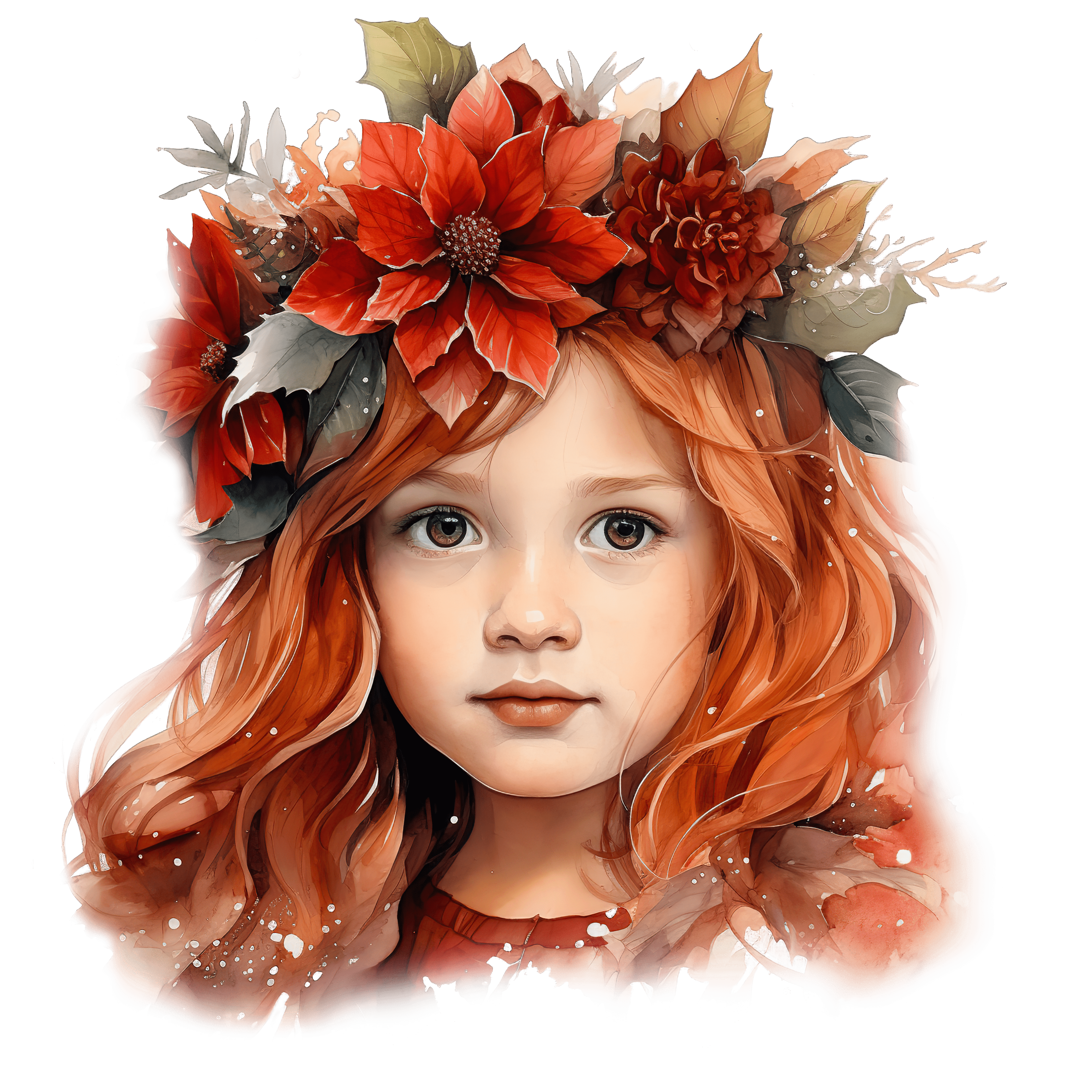 Young Girl With Floral Headpiece Featuring Red Flowers and Leaves Young girl with red hair adorned with a headpiece of red flowers and leaves.Download PNG ▼Download JPG ▼Related posts:Refreshing Lemonade Glass with Mint and Lemon SlicesCartoon hedgehog with pumpkins clipart illustrationDelicate Peach Roses with Foliage on Black BackgroundWoman with Red Bow and Vintage Hairstyle IllustrationGlass Dessert Bowl with Whipped Cream and StrawberriesCluster of Ripe Blackberries with Green Leaves fruit purple branch food clipartVibrant Blue And Purple Butterfly With Sparkling WingsCartoon fox clipart character with large eyesOrange Fruit Hanging from Branch with Green LeavesRaccoon with Wizard Hat Clipart IllustrationVibrant Blue Butterfly Showcasing Intricate Wing PatternsVibrant Butterfly With Black Yellow And Red Wings